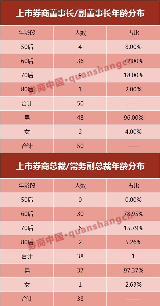 券商中国记者统计的数据显示,在50位上市券商董事长(含副董事长)中,60后共计36人,占比为72%;在38位总裁(含总经理、执行副总裁)中,60后共计30人,占比高达78.95%。可以发现两者均远远超过60后在整个上市券商高管中58.07%的比例,表明上市券商的董事长、总裁基本以60后为主。