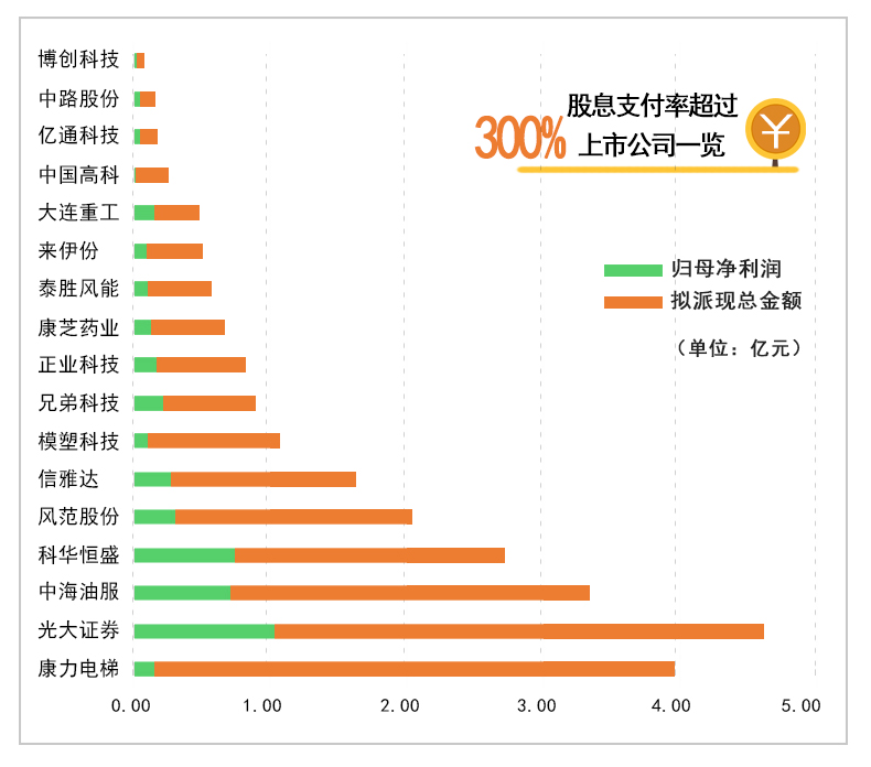 21数据新闻实验室进一步梳理发现,上述1673家上市公司中,康力电梯、光大证券、中海油服、风范股份、信雅达等107家公司拟现金分红金额超当期净利润。