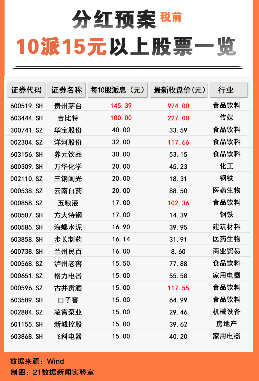 贵州茅台则是连续九年蝉联A股“分红王”,每10股现金分红145.39元。