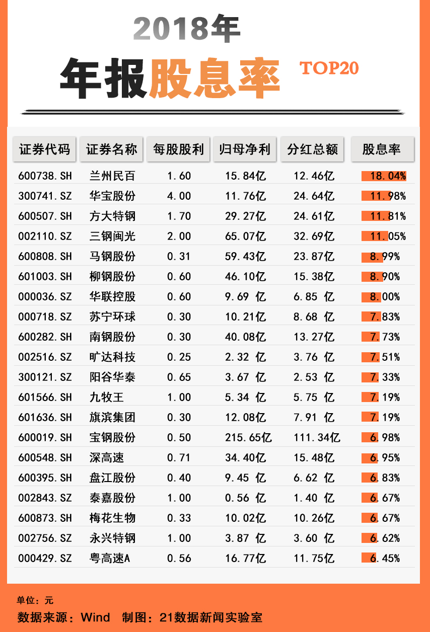 据Wind数据统计,以4月30日收盘价为准,有4家A股公司股息率超过10%,包括兰州民百、华宝股份、方大特钢、三钢闽光。股息率超5%的个股合计54只。