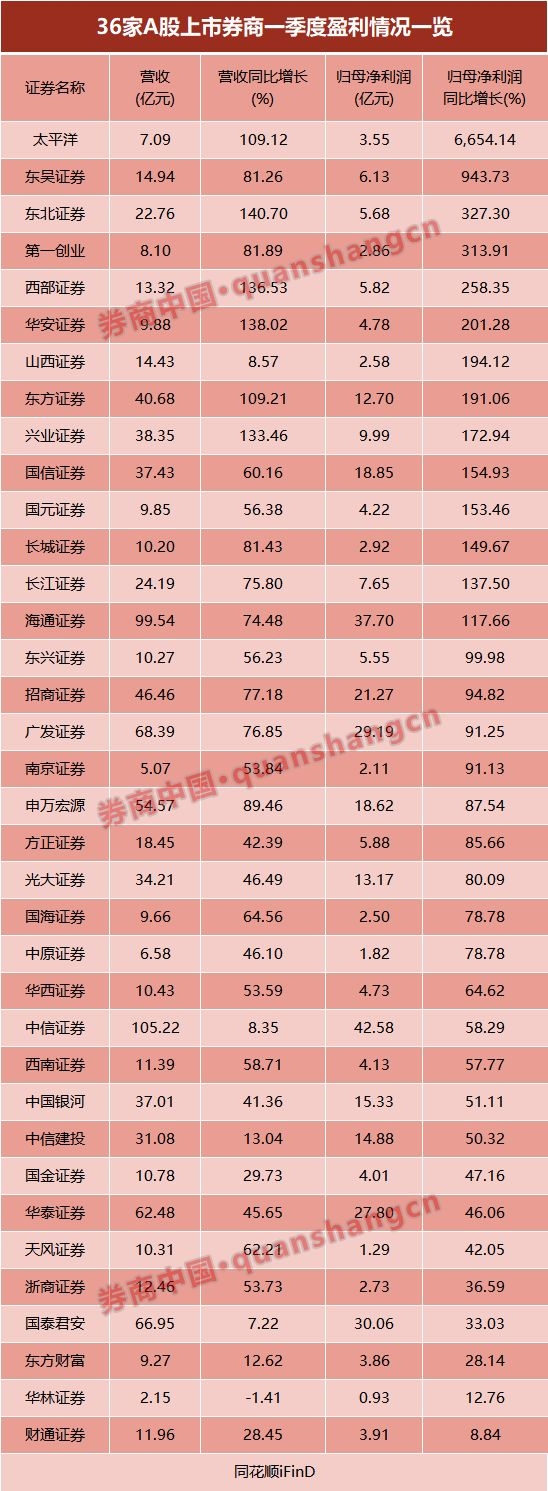 直观看业绩数据,今年一季度,无论是营收增速,还是净利润增速,东方财富确实不及多数传统券商。36家已披露一季报的上市券商中,太平洋证券一季度归母净利润同比增长近67倍;东吴证券净利润同比增长超9倍。此外,东北证券、第一创业证券、西部证券、华安证券等12家券商的净利润也实现了翻番。