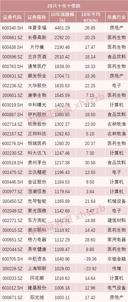 近十年来,A股所有股票中涨幅超过5倍的有108只,超过10倍的有29只。十年10倍的这29只个股,十年平均ROE的中位数为14.88%。在此期间,上证综指的涨幅是24.72%,沪深300指数的涨幅是50.2%,中证500指数的涨幅是74.59%,深证红利指数的涨幅是132.51%。
