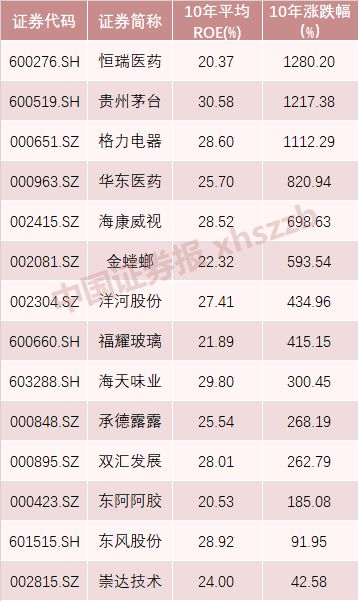 Wind数据显示,在2009年至2019年10年时间内,净资产收益率ROE(扣除/摊薄)连续超过15%的上市公司,A股有14家,分别是双汇发展、贵州茅台、海天味业、海康威视、格力电器、华东医药、洋河股份、承德露露、恒瑞医药、崇达技术、东风股份、福耀玻璃、东阿阿胶、金螳螂。