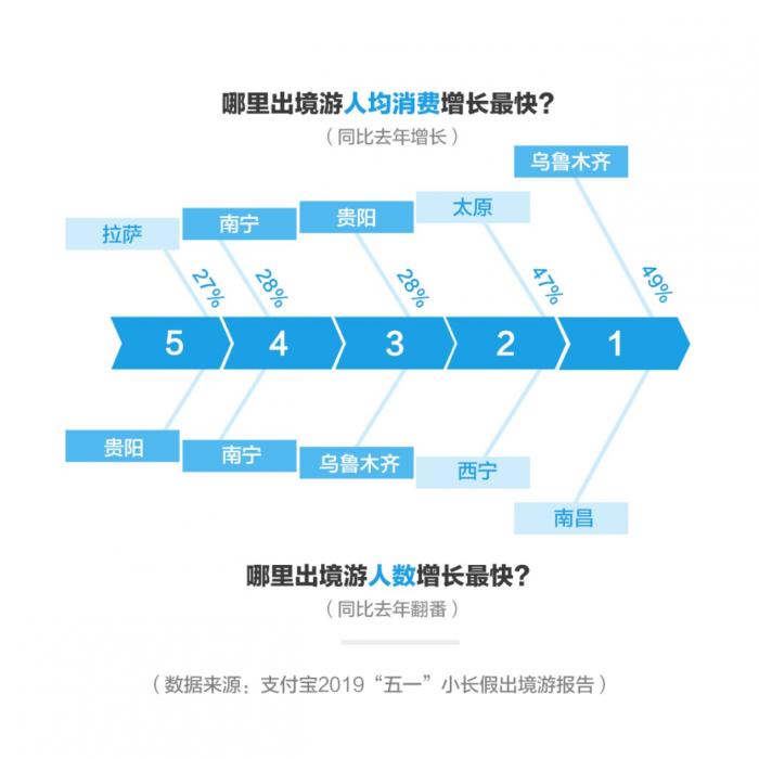 “五一”哪里人最爱出境玩?数据显示:非一线城市人的出境游热情,已超越北上广。南昌、西宁、乌鲁木齐、南宁、贵阳出境游人数增长最快,数据都比去年实现了翻倍;而出境游人均消费增长最快的TOP5则依次为:乌鲁木齐(49%)、太原( 47%)、贵阳和南宁(28%)、拉萨(27%)。