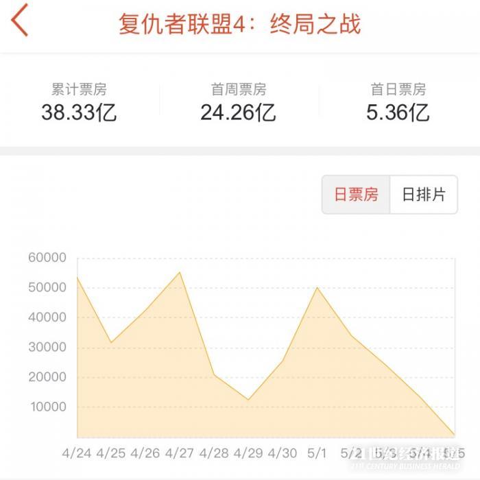 细分到各部电影,《复仇者联盟4:终局之战》(下称《复联4》)成最大赢家。中国电影票房数据显示,《复联4》在“五一档”收获12.17亿元,占“五一档”总票房超8成(80.54%),同时,截至发稿前(09:33),《复联4》累计票房已达38.35亿元,早已进入国内影史票房前三。