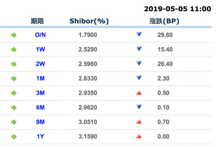 而从银行间资金市场的情况来看,节后第一个工作日,短期资金价格多有走低趋势,具有标志意义的DR007加权利率为2.41%左右,其它期限的质押式回购利率也都有不同程度下调。Shibor方面,包括隔夜、7天、14天、1个月在内的短期shibor利率都有所回落。其中隔夜shibor报1.7900%,比4月30日下调29.60BP,再次回到“1”时代。