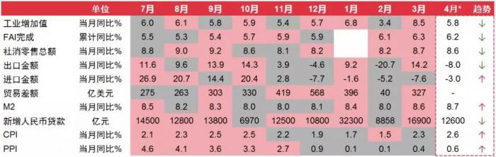 资料来源:Wind,中信证券研究部。注:统计了2018年7月至2019年4月的国内主要宏观数据公布情况,红色底色表示数据公布的时候高于市场一致预期,黑色底色表示低于一致预期,4月数据为中信证券研究部宏观组预测