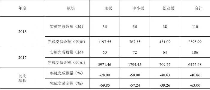 2018年深市完成110单并购重组,同比下降40.86%;并购交易金额2395.99亿元,同比下降63.00%。虽然重大资产重组数量、金额有所下降,但提质增效成果显著,突出服务实体经济主旨。