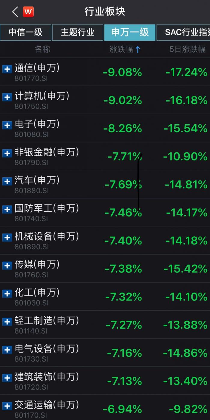 三大股指罕见暴跌之下,行业板块更是全军覆没,全部飘绿。按照申万一级行业分类,通信行业以9.08%的跌幅领跌大盘,计算机的跌幅也达到了9.02%。