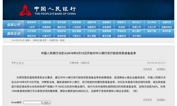中国人民银行官网发布消息称,为贯彻落实国务院常务会议要求,建立对中小银行实行较低存款准备金率的政策框架,促进降低小微企业融资成本,中国人民银行决定从2019年5月15日开始,对聚焦当地、服务县域的中小银行,实行较低的优惠存款准备金率。