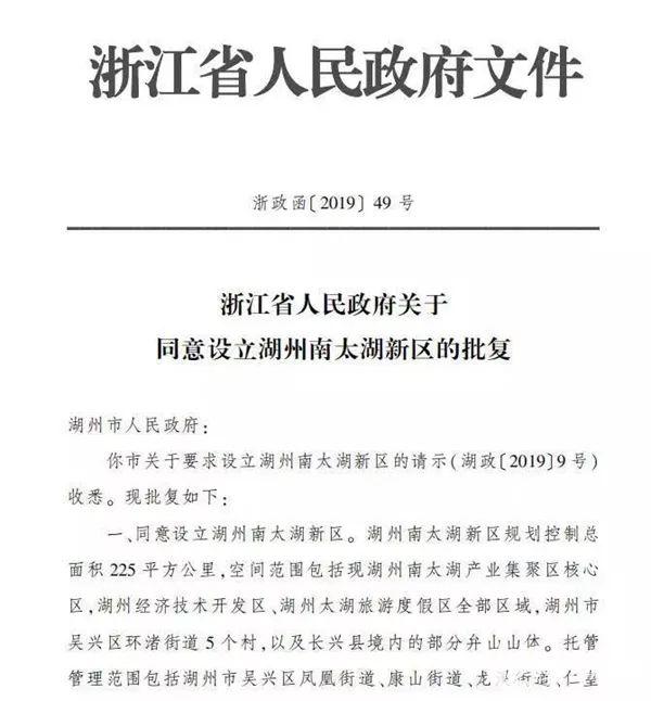 (4月30日,浙江省人民政府正式发文同意设立湖州南太湖新区)