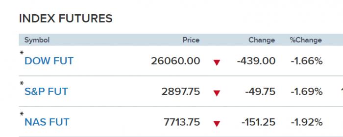 受市场消息冲击,市场陷入新一轮恐慌。当地时间周日晚间,道琼斯工业平均指数期货一度暴跌450点,截至发稿,跌幅达1.66%,标准普尔500指数期货也下跌1.69%,纳斯达克100指数期货跌幅1.92%。