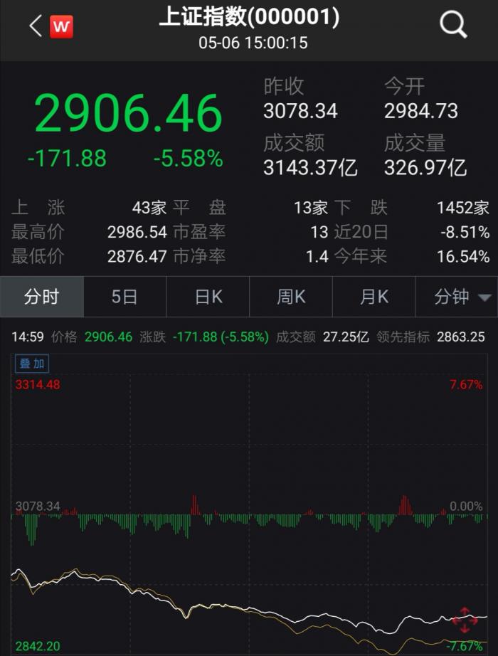 5月6日,上证指数开盘直接跌破3000点关口,盘中一度击穿2900点,最终,A股三大股指全线下挫。