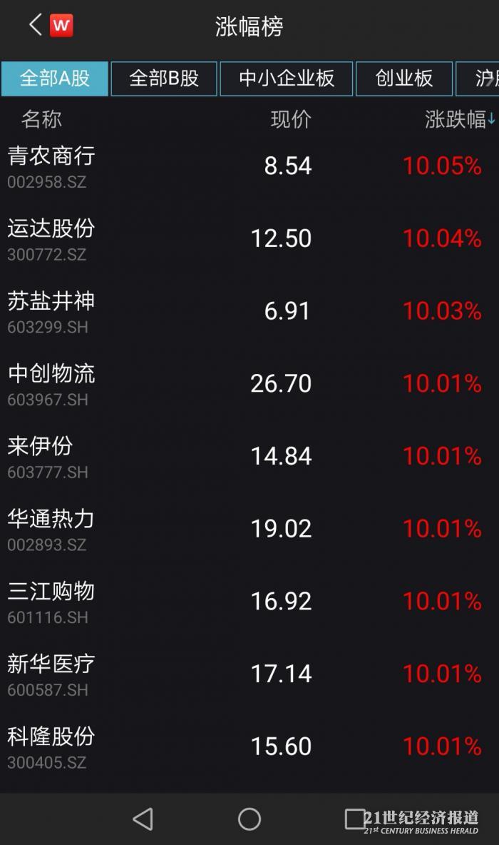 据Wind数据,21世纪经济报道记者发现,在3465只个股中,有105只个股翻红,科融环境、青农商行、三江购物等27只个股录得涨停,堪称坚挺。