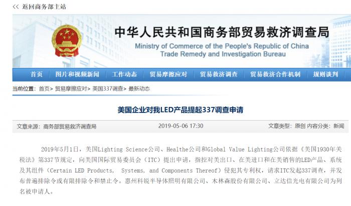 5月6日,商务部网站最新信息显示,2019年5月1日,美国Lighting Science公司、Healthe公司和Global Value Lighting公司依据《美国1930年关税法》第337节规定,向美国国际贸易委员会(ITC)提出申请,指控对美出口、在美进口和在美销售的LED产品、系统及其组件(Certain LED Products, Systems, and Components Thereof)侵犯其专利权,请求ITC发起337调查,并发布普遍排除令或有限排除令和禁止令。