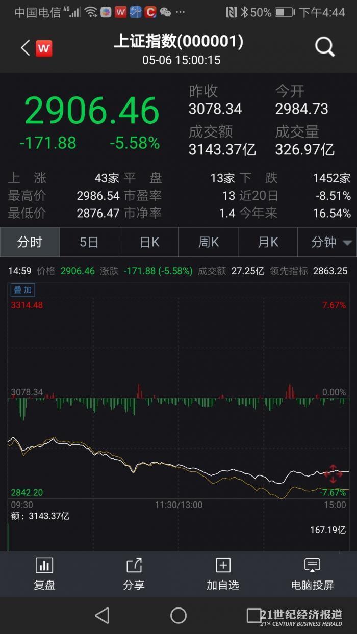当日,沪指跌至2906点,跌5.58%,创下年内单日最大跌幅;创业板指下挫更猛,跌穿1500点,跌幅近8%。超过三分之一的股票跌停。