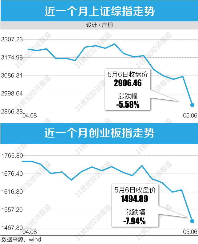5月6日,A股全天呈现单边下跌趋势,沪指跌幅一度接近6.6%,盘中最低跌至2876.47点;创业板指更是一度重挫8.4%,盘中最低跌至1487.45点。