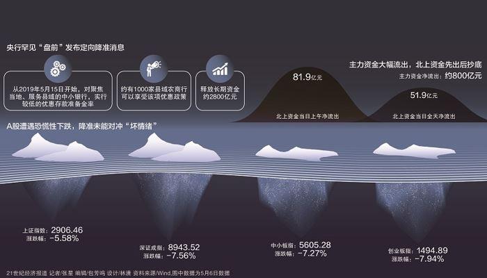 5月6日,受外围因素影响,A股三大股指低开低走,截至收盘,上证指数跌5.58%收报2906.46点;深证成指跌7.56%收报8943.52点;创业板指跌7.94%收报1494.89点。具体来看,两市3466只个股下跌,其中1146只个股跌停,千股跌停再上演。当日,A股总市值蒸发3.58万亿元。就在当日开盘前30秒,央行发布定向降准消息,但似乎未能对冲股市的“坏情绪”。与此同时,全球股市当日开盘亦全线下挫,美股期指亦大幅杀跌。受资本市场动荡影响,全球避险情绪迅速升温。