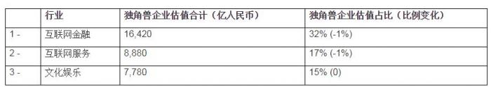 互联网金融独角兽企业总估值以超1.6万亿人民币占据首位;互联网服务独角兽企业以近9000亿人民币的总估值保持第二的位置;文化娱乐行业独角兽企业以7780亿总估值排在第三。