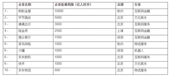 排名前十的企业均为超级独角兽,其中蚂蚁金服仍以超1万亿的估值位列第一,字节跳动保持超5000亿位列第二,滴滴出行保持超3000亿的估值位列第三;京东数科、菜鸟网络、大疆和快手以超1000亿的估值并列第六。
