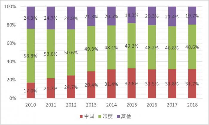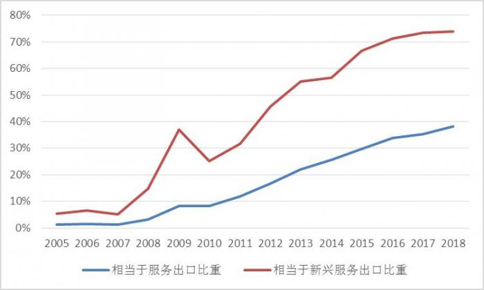 报告显示,2010年开始,中国国际服务外包业务规模占全球服务外包市场比重跃升为第二大全球服务外包承接国。自2014年以来,中国国际服务外包业务占全球服务外包市场比重更是超过30%。