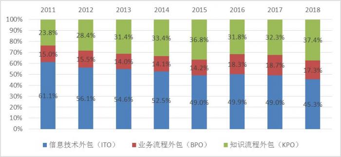 报告显示,2018年,我国企业承接离岸信息技术外包(ITO)、业务流程外包(BPO)和知识流程外包(KPO)的执行额分别为2655.6亿元、1014.4亿元和2196.6亿元,在离岸服务外包业务中的占比分别为45.3%、17.3%和37.4%。以研发服务、工程技术、检验检测等为代表的高端生产性服务外包业务快速增长,同比分别增长15.5%、27.1%和74.5%。