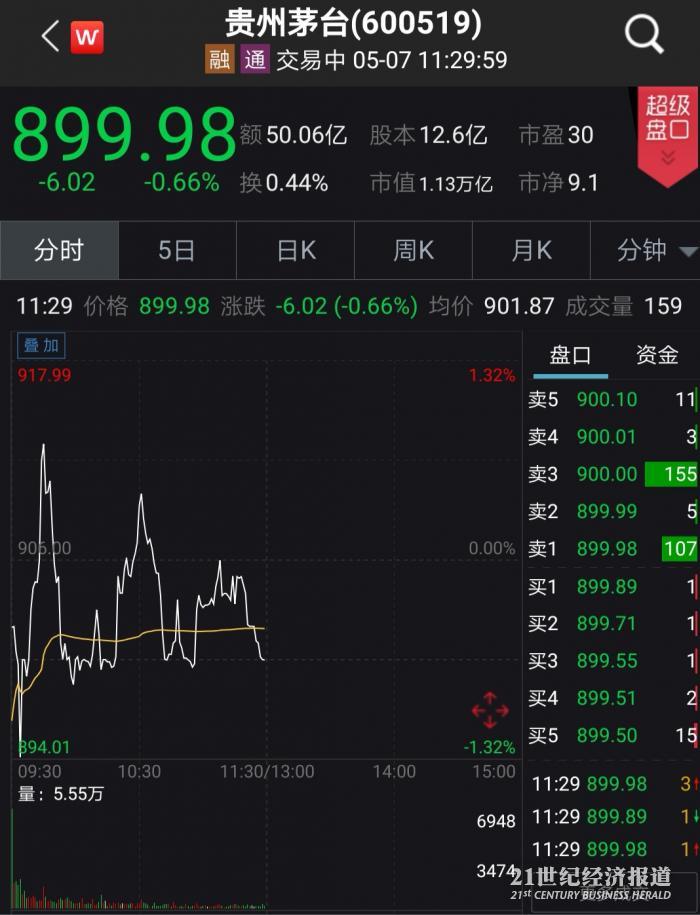 5月7日,贵州茅台在上一交易日大跌6.98%的基础上,早盘仍然翻绿,股价维持在900元附近震荡。