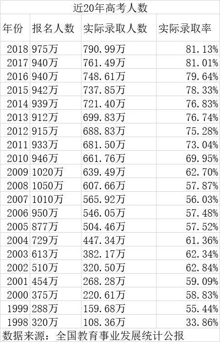 首先在于大学录取率已连续12年增长,且已从1998年的33.86%增长到2018年的81.13%,20年间翻了约2.4倍。这意味着还会有更多的人升入大学。