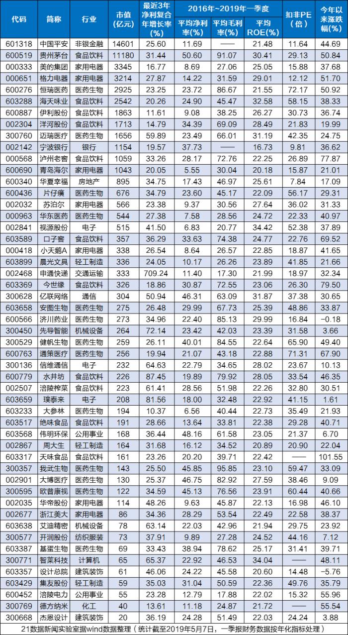 截至5月7日,上述公司今年以来股价平均涨幅为35.11%,跑赢同期大盘18个百分点。其中领涨的天味食品(603317.SH)、今世缘(603369.SH)、泸州老窖(000568.SZ)均来自食品饮料行业,今年以来各上涨101.55%、79.5%、77.87%。