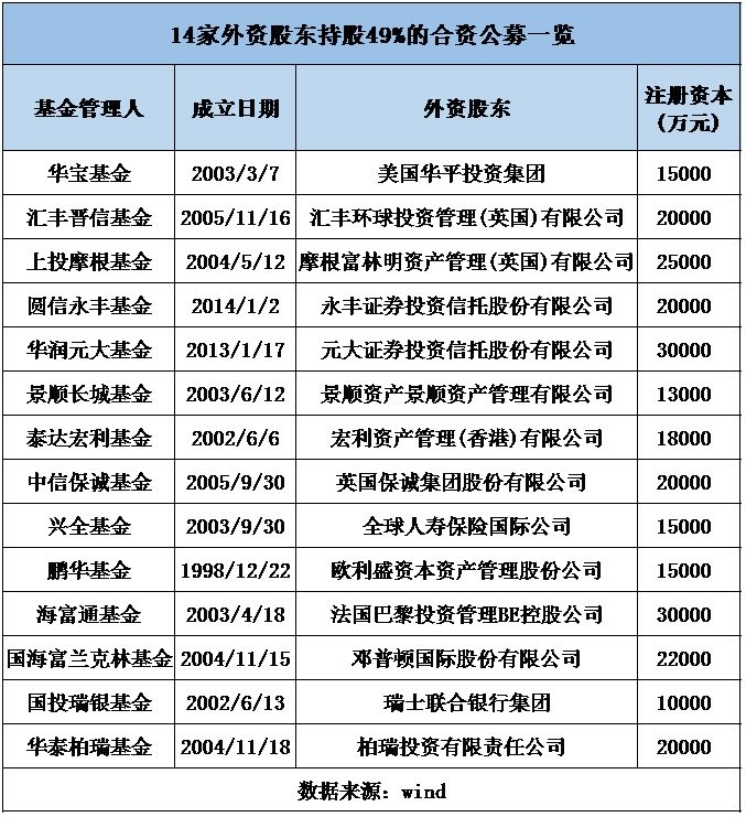 基金君Wind数据显示,截至目前,143家公募基金公司中,中外合资企业已达到41家。其中,外资机构持股比例为49%的就有14家。