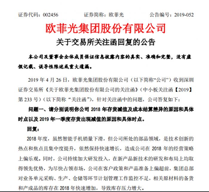 随后,深交所要求欧菲光详细披露公司2018年和2019年一季度存货减值及成本结算差异的原因和具体时点。
