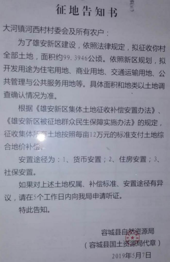 5月7日,雄安新区征迁安置工作正式启动实施。21世纪经济报道记者获悉的两张征地告知书图片显示,第一批征地约159公顷,每亩12万补偿。