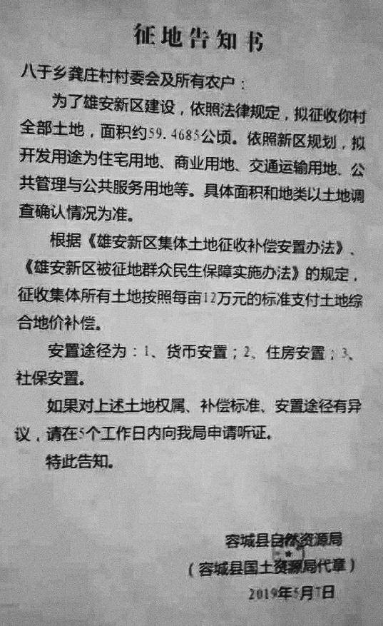 雄安发布消息,5月7日,雄安新区召开党工委委员会议,批准容城县实施2019年第一批次城市用地土地转用征收工作,标志着雄安新区征迁安置工作正式启动实施。容城县自然资源局分别在大河镇河西村、八于乡龚庄村村务公开栏张贴征地告知书。