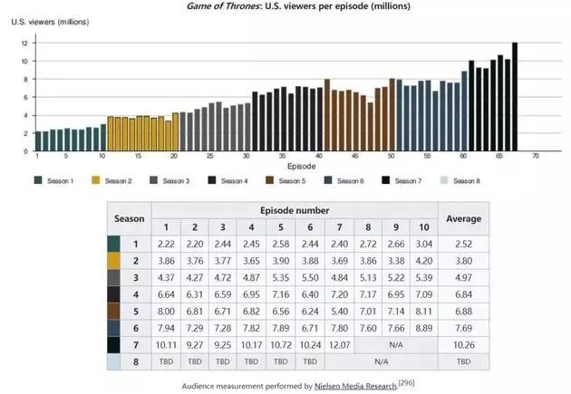 据尼尔森媒体研究所的数据,到了《权力的游戏》第七季,仅仅是美国国内,平均每集的观众数量就突破了1000万人,这也意味着仅仅在美国,GoT第七季就给HBO带来了10.7亿美元的收入。