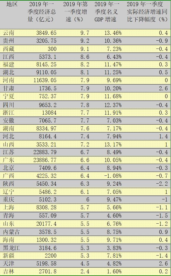 2019年一季度实际经济增速前5名,分别是云南、贵州、西藏、江西、福建。
