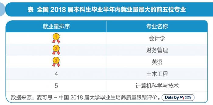 根据麦可思数据,会计学专业位居2018届本科毕业生就业量首位,其次是财务管理、英语、土木工程和计算机科学与技术。