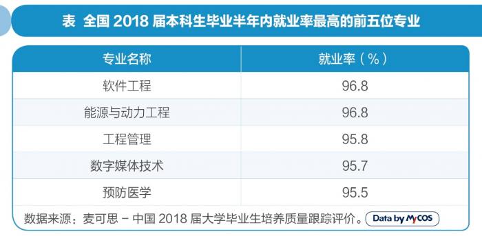 如果说就业量的大小与该专业毕业生数量多少有关,那么就业率则体现该专业毕业生的就业难易程度。从2018届本科生毕业半年内数据来看,软件工程和能源与动力工程专业的毕业生就业率最高,均为96.8%,工程管理专业就业率为95.8%,数字媒体技术(95.7%)和预防医学(95.5%)位列第四和第五位。