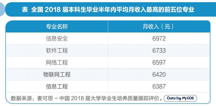 薪资收入可谓大学毕业生就业时最关注的因素之一,也是评价毕业生就业指标的重要参考。根据麦可思数据,IT相关专业占据月收入最高的前五席。信息安全专业的毕业生月收入(6972元)最高,第二位为软件工程(6733元)。