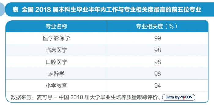 麦可思数据显示,医学类专业毕业生的工作与专业相关度较高。其中医学影像学专业相关度为99%,临床医学和口腔医学均为98%。医疗行业专业化高、入职门槛高,或许是出现这一现象的原因之一。