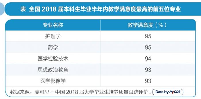 麦可思数据显示,护理学和药学专业的毕业生对学校的教学满意度最高,均为95%。教学满意度一定程度上反映了专业的教学质量,体现了专业教学的有效性和实用性等。