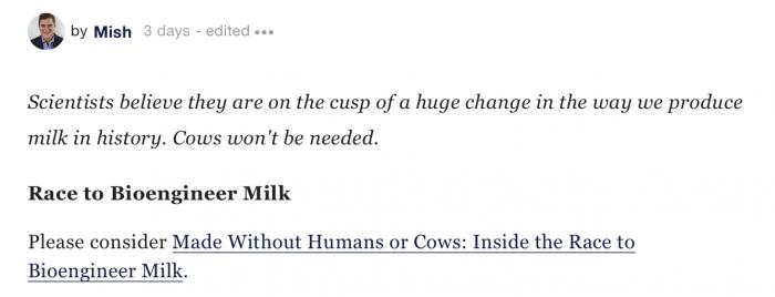 有投资者微博评论称,“人造肉炒得火热,人造奶也鸡犬升天,咋不干脆炒个’人造牛’呢?”