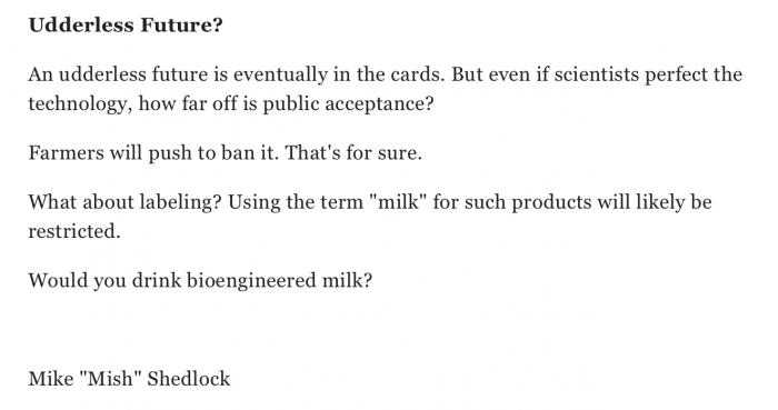 研究者表示人造奶最大的优势在于更加健康, 此外,人造奶也更有利于环保。也有支持者表示,人造奶可以解放奶厂的牲畜,避免它们受到不必要的虐待。当然,人造奶想要真正被市场认可,不仅要控制成本还要准备好接受奶农以及奶制品消费者的考验。
