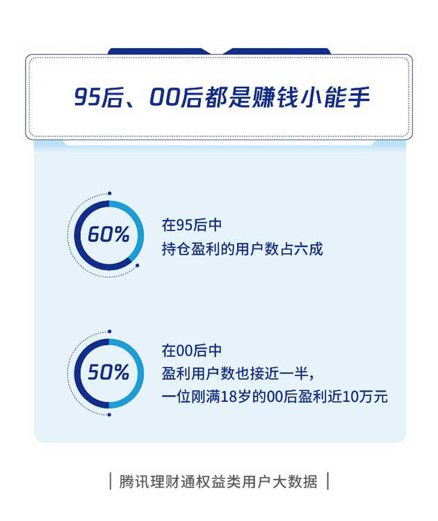 互联网理财作为一种年轻化的投资理财方式,受到年轻一代的热捧。日前,腾讯理财通、腾讯金融科技智库联合发布了一份《腾讯理财通权益类用户大数据》,年轻一代的理财能力也随之浮出水面。数据显示,持有权益类基金中的95后用户近六成实现盈利,而刚满18岁的00后也有近五成实现盈利,更有一位00后过去一年已赚近10万。