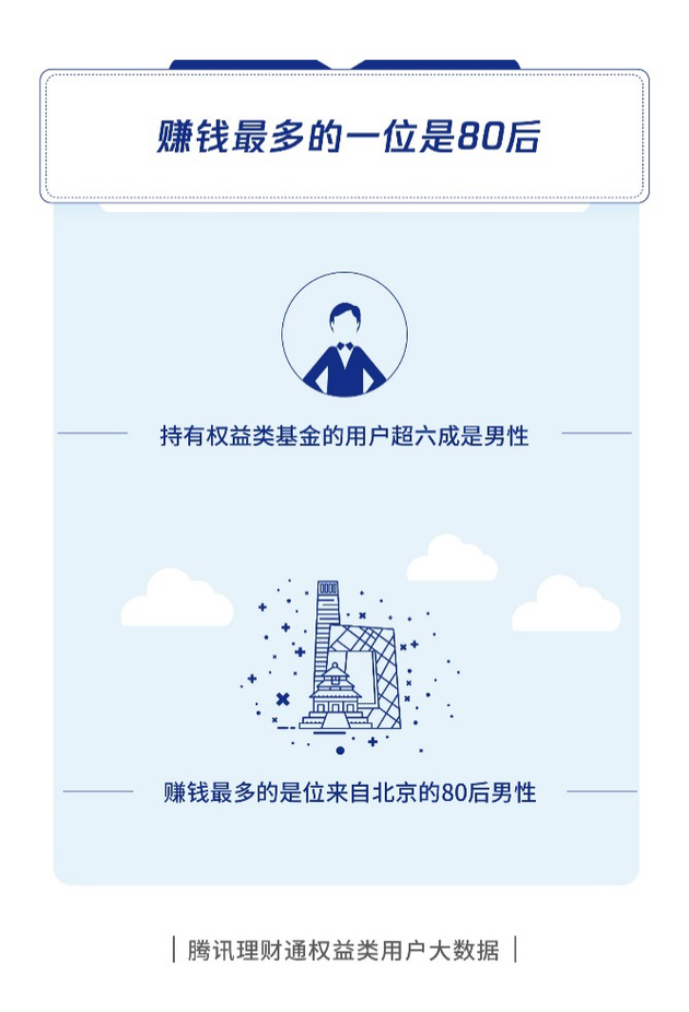 数据显示,理财通权益类用户中盈利最多的是一位北京80后男性。而从性别来看,持有权益类基金的用户超六成是男性。此外,数据显示,40后即便年过古稀也不忘投资理财,实现老当益“赚”,人均盈利名列前茅。