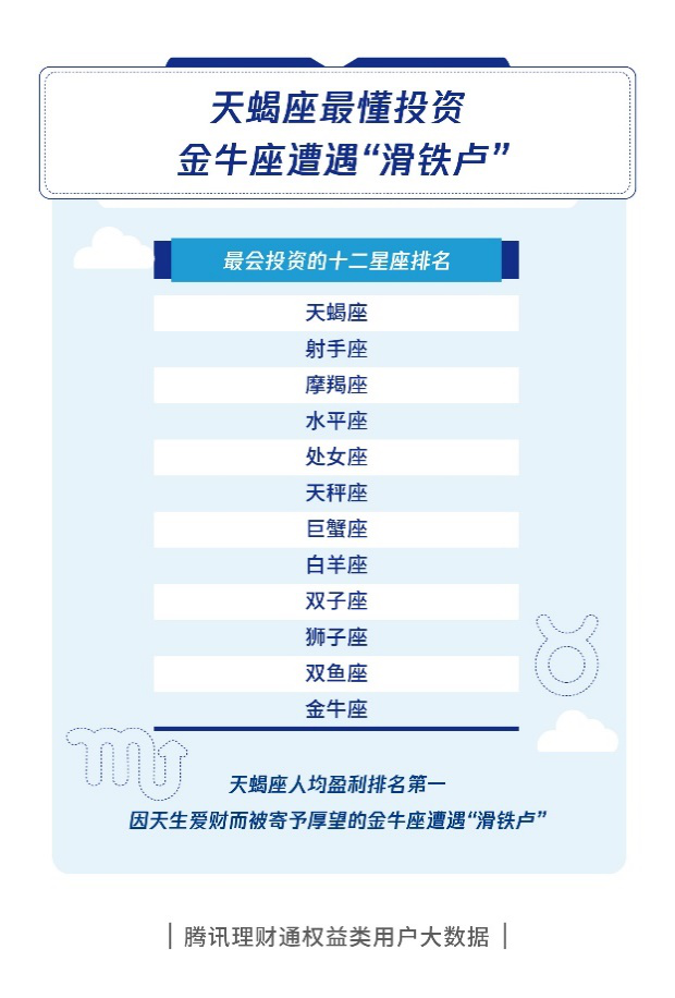 仅从此次报告的星座分布来看,最懂投资的还是天蝎座,人均盈利排名第一。紧随其后的是射手座、摩羯座和水瓶座。而让人意外的是,因天生爱财而被寄予厚望的金牛座过去近一年时间里却遭遇“滑铁卢”,是投资权益类基金人均盈利最少的星座。