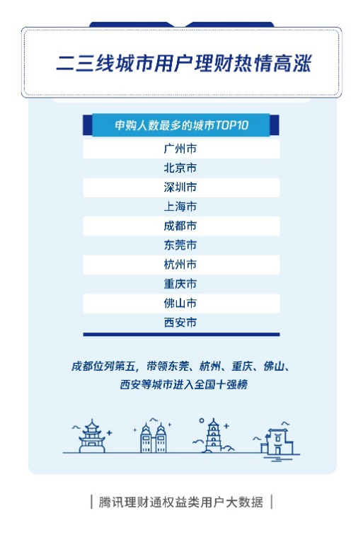 从区域分布来看,虽然北上广深等一线城市仍是用户量最大的区域,但随着二三线城市用户投资意识的逐渐增强,部分城市用户的理财热情也日益高涨。在腾讯理财通权益类用户数的城市排名中,成都位列第五,带领东莞、杭州、重庆、佛山、西安等多个城市进入全国十强榜,叫板北上广深。