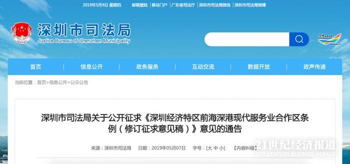 21世纪经济报道记者查阅到,深圳市司法局早在5月7日就将该条例的修订征求意见稿发布在其官网发布。据悉,该《条例》由深圳市前海管理局进行了全面修订,形成征求意见稿(下称《条例》)并提交深圳市司法局审查。