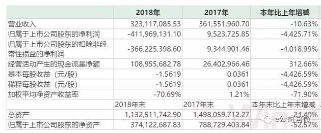 年报显示,去年公司实现营业收入3.23亿元,同比下降10.63%;实现归属于母公司净损益-4.12亿元,同比下降4425.71%,归属于母公司净损益大幅减少的主要原因系公司2018年度计提了大额资产减值损失及预计负债。