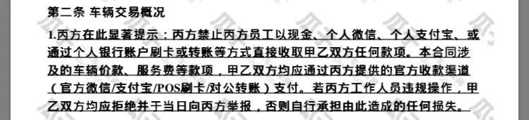 丙方禁止丙方员工以现金、个人微信、个人支付宝、或通过个人银行账户刷卡或转账等方式直接收取甲乙(代指车辆的买受人与出卖人)双方的任何款项。