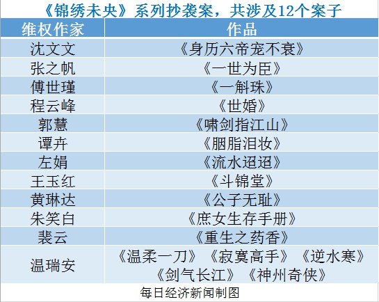 涉嫌抄袭200余本小说,多达2000余万字的《锦绣未央》,从2016年9月到2017年2月,先后被沈文文、张之帆、傅世瑾、程云峰等在内的12位作者陆续起诉,堪称有史以来抄袭比例和维权规模最大的侵权案件。